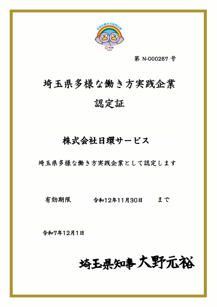 - 弊社は、「埼玉県多様な働き方実践企業」として、令和7年12月1日付で5年間の認定をいただきました。